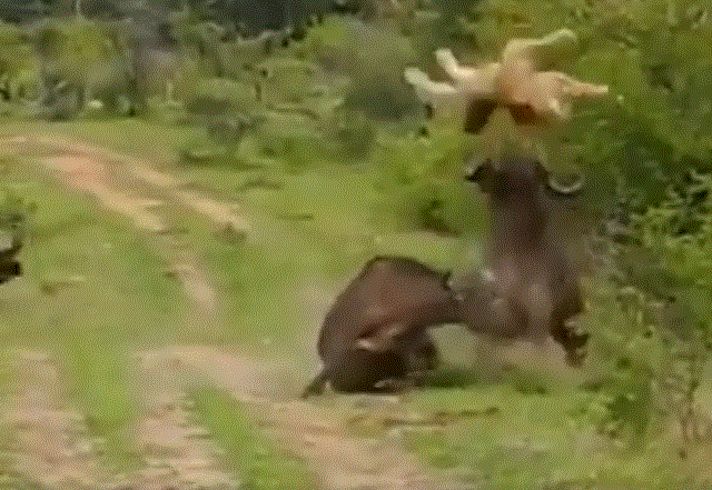 भैँसीले बाघलाई सिङले उचाल्दै पछार्दै गरिरहेको दृश्य भिडियोमा देख्न सकिन्छ ।