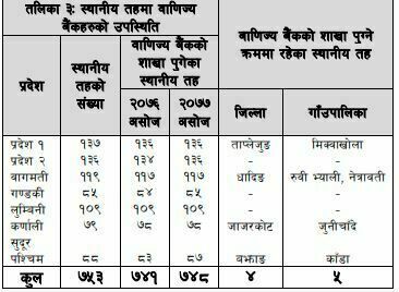 ताप्लेजुङ, धादिङ, जाजरकोट र बझाङका ५ स्थानीय तहमा शाखा कार्यालय खुल्न बाँकी रहेको छ। राष्ट्र बैंकका अनुसार ताप्लेजुङको मिक्वाखोला, धादिङको रुवी भ्याली र नेत्रावती, जाजरकोटको जुनीचाँदे र बझाङको काँडा गाउँपालिकामा शाखा कार्यालय पुग्न सकेका छैनन् ।