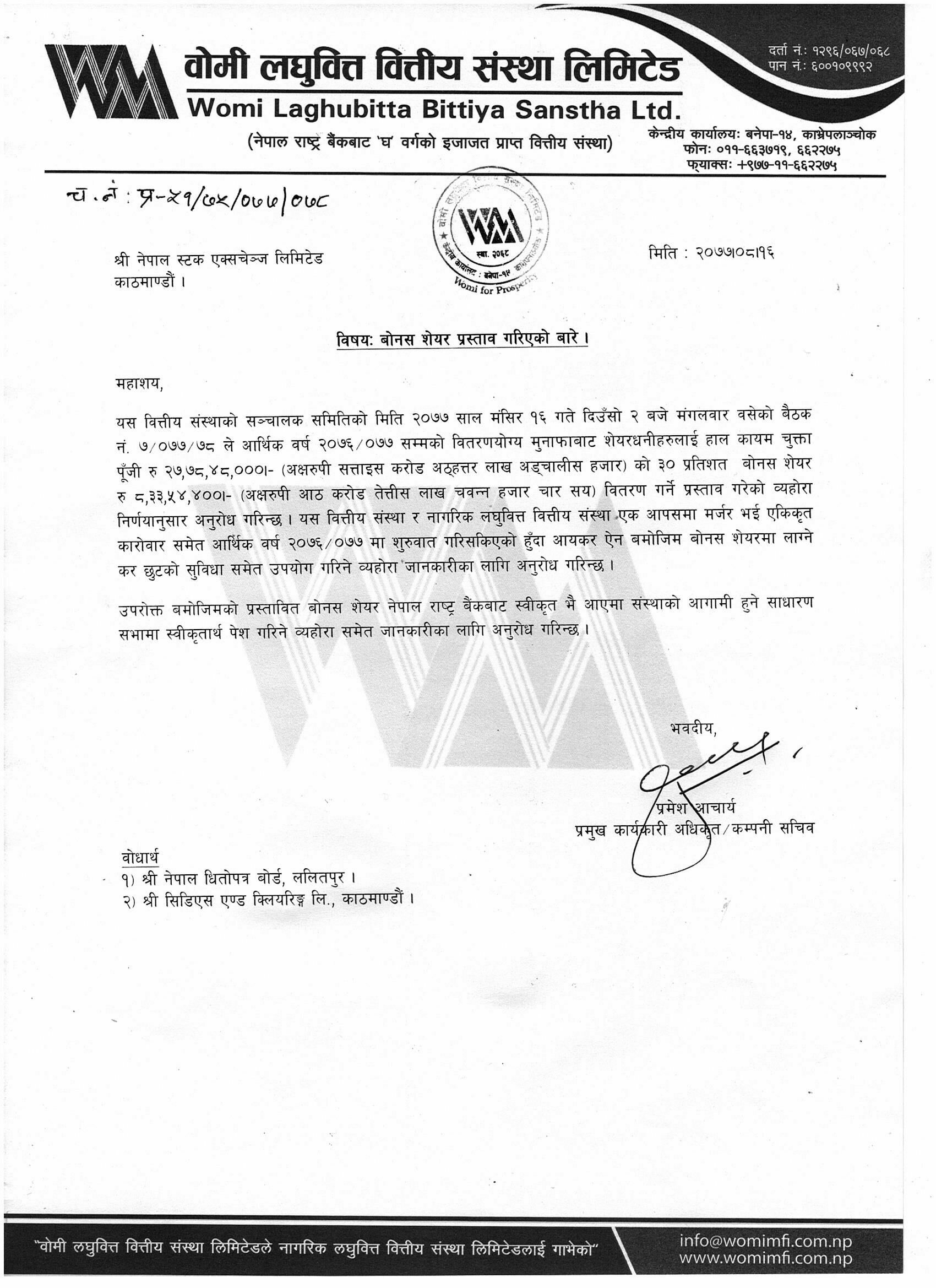 संस्थाको मंसिर १६ गते, मंगलबार बसेको सञ्चालक समितिको बैठकले आर्थिक वर्ष २०७६/७७ को मुनाफाबाट संस्थाका शेयरधनीहरूलाई हाल कायम चुक्ता पुँजीको ३० प्रतिशतका दरले बोनस शेयर वितरण गर्ने प्रस्ताव गरेको हो ।