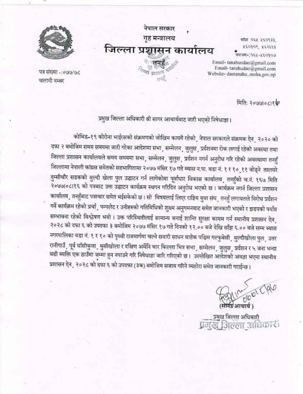 प्रमुख जिल्ला अधिकारी सागर आचार्यले एक विज्ञप्ति जारी गर्दै भने, “तनहुँ जिल्लामा नेपाली कांग्रेस समेतको सहभागितामा २०७७ मंसिर १७ गते व्यास नपा वडा नं। १ र १०, ११ जोड्ने तालघरे दुम्सीचौर सडकको बुल्दी खोला पुल उद्धाटन गर्न लागेकोमा पूर्वाधार विकास कार्यालय तनहुँको च।न। १६७ मिति २०७७ मंसिर १८ को पत्रबाट उक्त उद्घाटन कार्यक्रम स्थगन गरिदिन अनुरोध भएको छ ।”