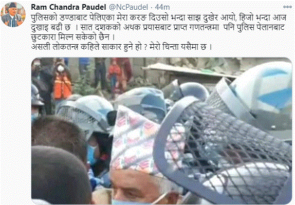 उनले सामाजिक सञ्जाल ट्वीटरमा एक ट्वीट गर्दै सात दशकको अथक प्रयासबाट प्राप्त गणतन्त्रमा पनि पुलिस पेलानबाट छुटकारा मिल्न नसकेको बताएका छन् ।