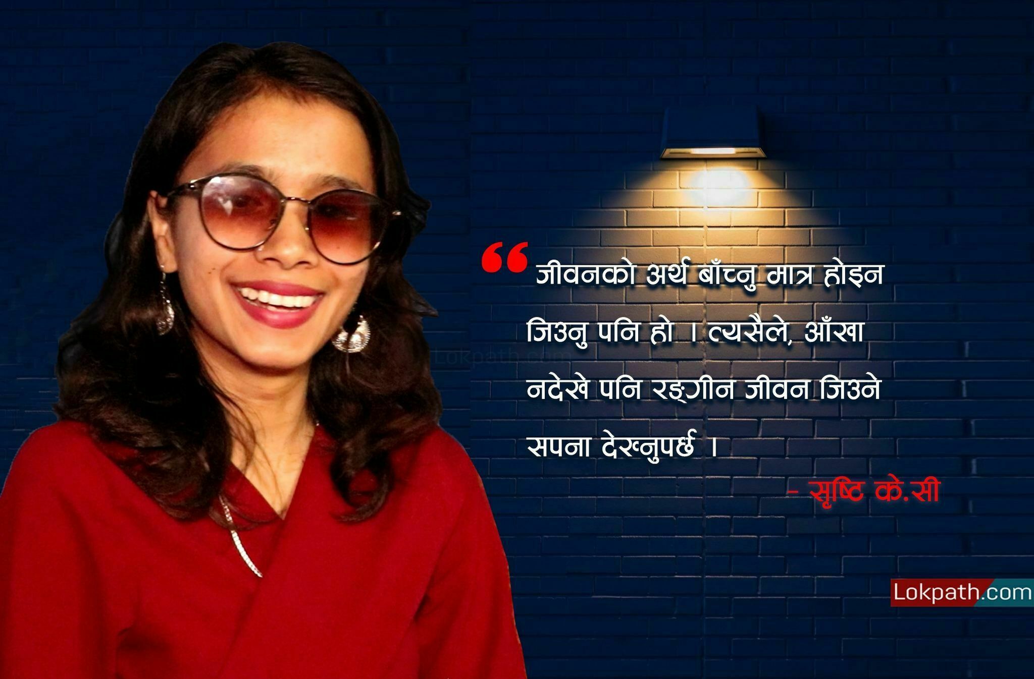 हरेक साना भन्दा साना उपलब्धिलाई पनि ठूलो सफलताको खुड्किलो मान्दै खुसी हुने सृष्टि अरुका लागि केही गर्न पाउँदा खुसी हुन्छिन् । सानोसानो कुरामा औधी मुस्कुराउँछिन् । मुस्कुराउन उनलाई जीवनले नै सिकाएको हो । १६ वर्षको कलकलाउँदो उमेरमा अचानक दृष्टि गुमेपछि सृष्टिले गरुन् के ? बरु हाँसीहाँसी तनावलाई फाँसी दिन सिकिन् उनले । उनको त्यही साहसले आज उनलाई देशभर चिनाएको छ । र, केही अन्य देशमा पनि ।