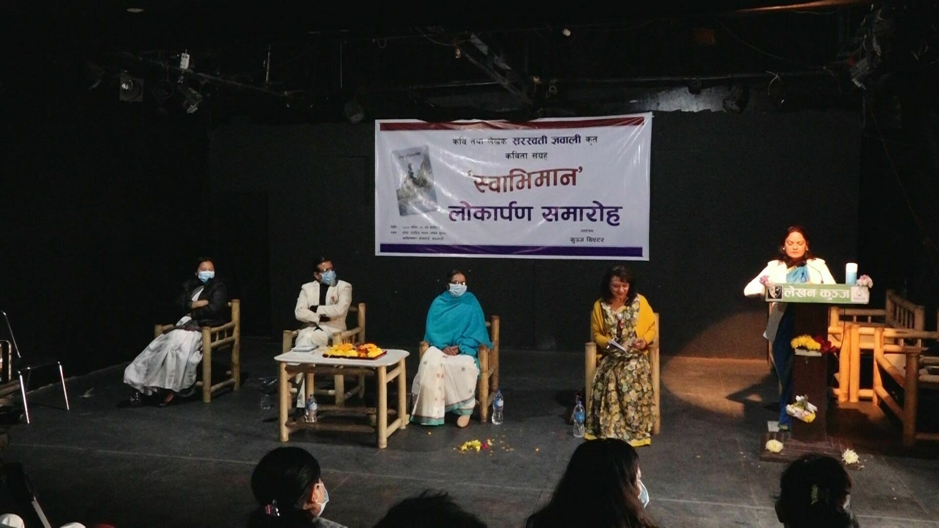 काठमाडौं । परराष्ट्र मन्त्री प्रदीप ज्ञवालीकी धर्मपत्नी सरस्वती ज्ञवालीको नयाँ कवितासंग्रह सार्वजनिक भएको छ । कवयत्री ज्ञवालीले जीवनका विभिन्न आरोह–अवरोह र अनुभूतिहरुलाई कवितामा उतारेकी छिन् । ‘स्वभिमान’ नाम दिइएको कविता संग्रहमा देश प्रेमको भाव झल्कने र वर्तमान समाजका विषयहरु पनि समेटिएको छ ।