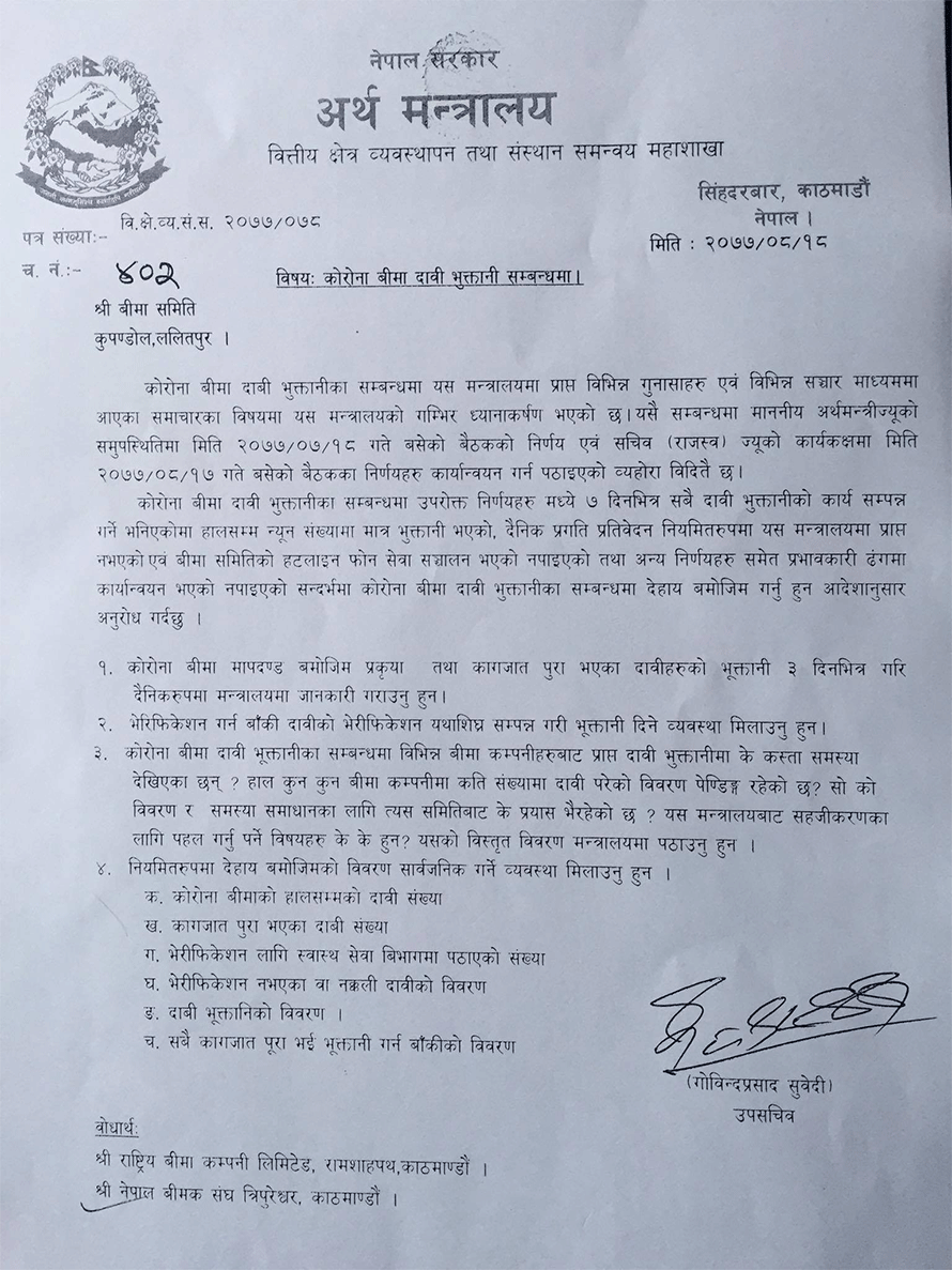 अर्थमन्त्रालयले पठाएको पत्रमा ‘कोरोना बिमाको हालसम्मको दाबी संख्या, कागजात पूरा भएका दाबी संख्या, प्रमाणीकरणका लागि स्वास्थ्य सेवा विभागमा पठाएको संख्या, प्रमाणीकरण नभएका वा नक्कली दाबी विवरण, दाबी भुक्तानीको विवरण र सबै कागजात पूरा भई भुक्तानी गर्न बाँकी विवरण सार्वजनिक समेत गर्नुहुन अनुरोध छ ।’