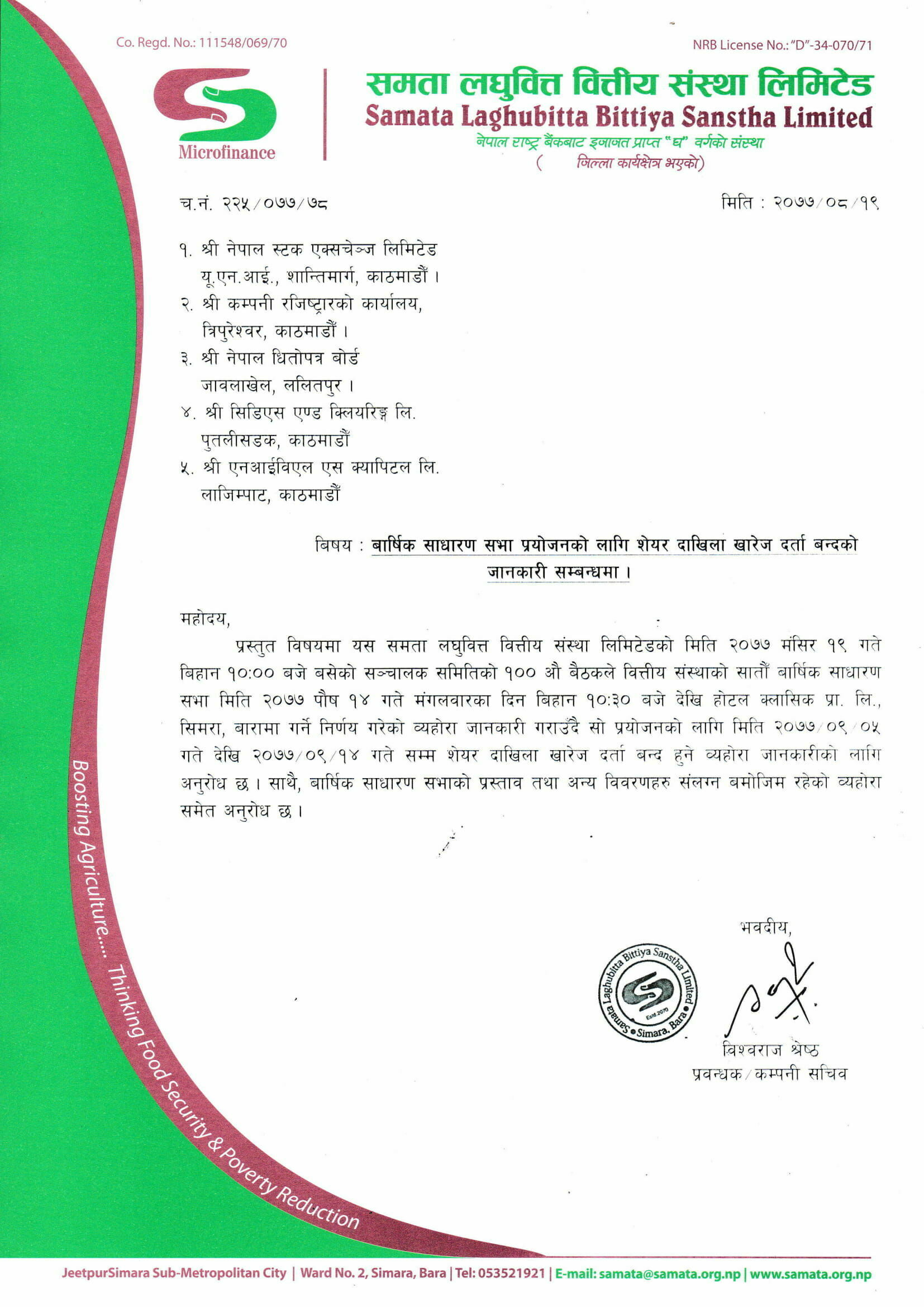 काठमाडौं । समता लघुवित्त वित्तीय संस्था लिमिटेडले सातौँ वार्षिक साधारण सभा आह्वान गरेको छ ।