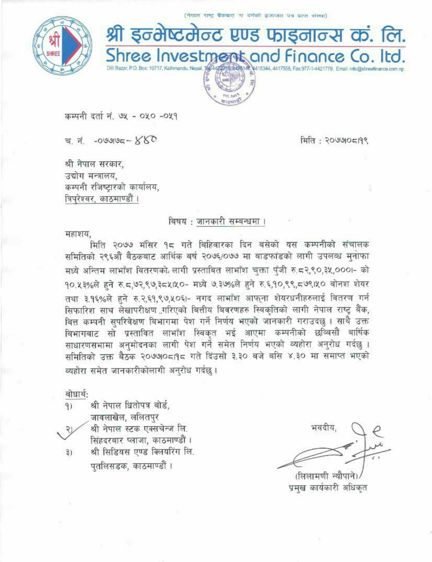 काठमाडौं । श्री इन्भेष्टमेन्ट एण्ड फाइनान्स कम्पनी लिमिटेडले १०.५३ प्रतिशत लाभांश घोषणा गरेको छ ।
