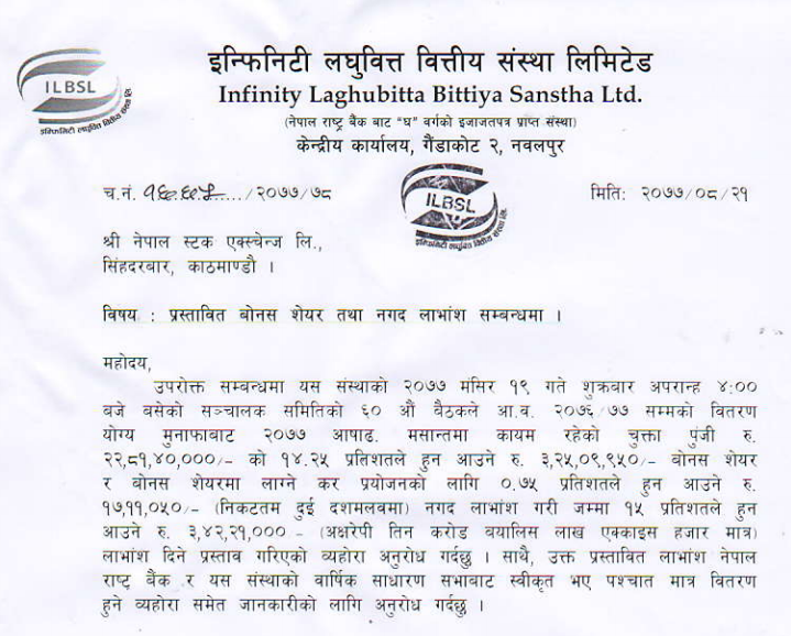 जस अनुसार कम्पनीले हाल कायम चुक्ता पुँजीको १४.२५ प्रतिशत बोनस शेयर र कर प्रयोजनको लागि ०.२५ प्रतिशत नगद गरि कुल १५ प्रतिशत लाभांश वितरण गर्ने प्रस्ताव गरेको हो ।