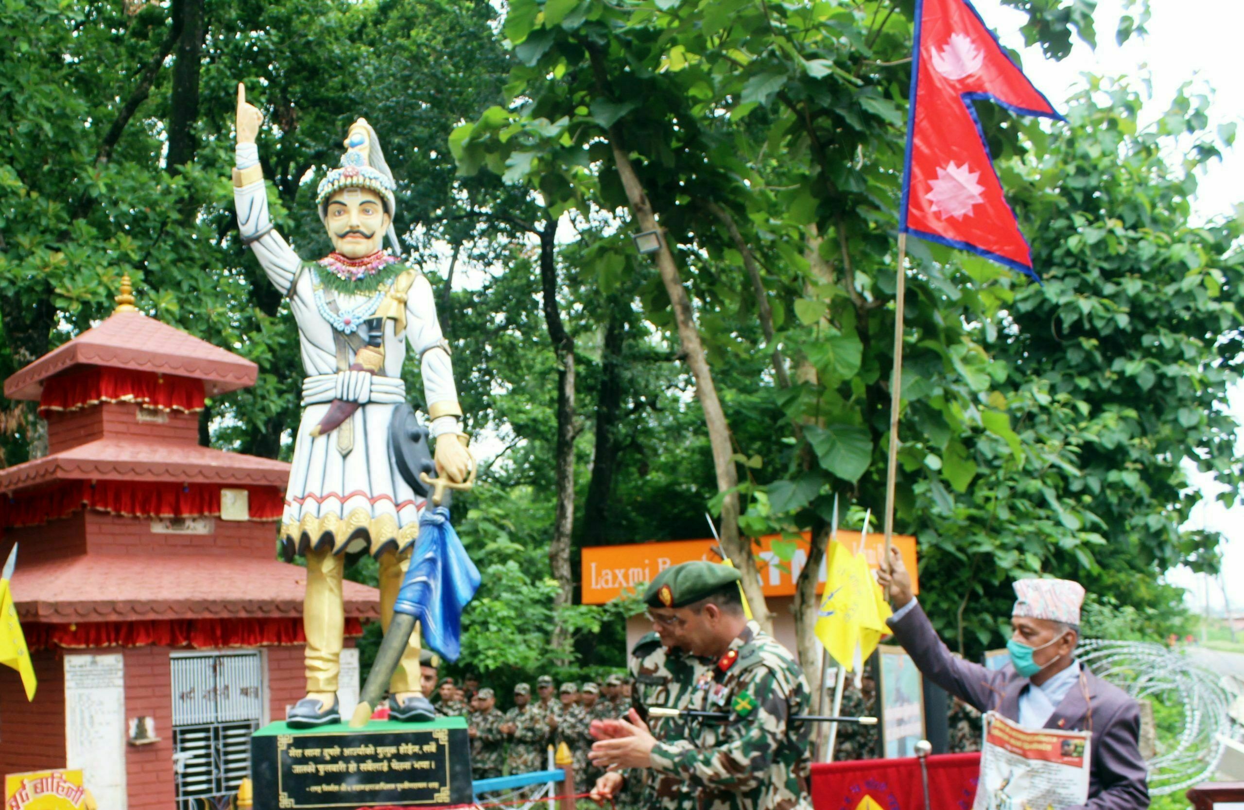 दमौली । नेपाली सेनाको खैरेनीटारस्थित श्री नम्बर ३ बाहिनीमा पृथ्वीनारायण शाहको पूर्णकदको शालिक अनावरण गरिएको छ । नेपाली सेनाका संस्थापक एवं राष्ट्रनिर्माता पृथ्वीनारायण शाहको सम्मानमा बाहिनीभित्र निर्माण गरिएको शालिकको शनिबार अनावरण गरिएको हो ।