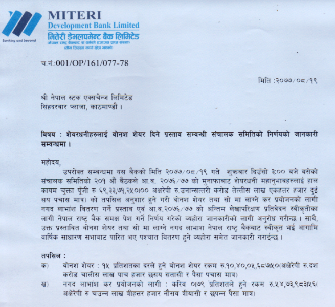 मितेरी डेभलपमेन्ट बैंकको १५.७९ प्रतिशत लाभांश प्रस्ताव, कति छ नगद र बोनस शेयर ?