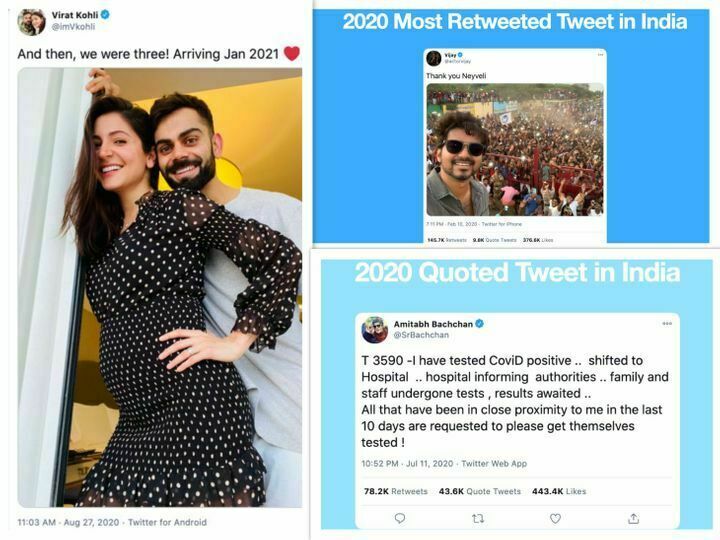 यो महिनासम्ममा भारतमा सबैभन्दा धेरै लाइक भएको ट्वीटमा भारतीय क्रिकेट टीमका कप्तान विराट कोहली र बलिउड अभिनेत्री अनुष्का शर्माको प्रेग्नेन्सी अनाउन्सको ट्वीट सबैभन्दा धेरै मन पराइएको छ ।