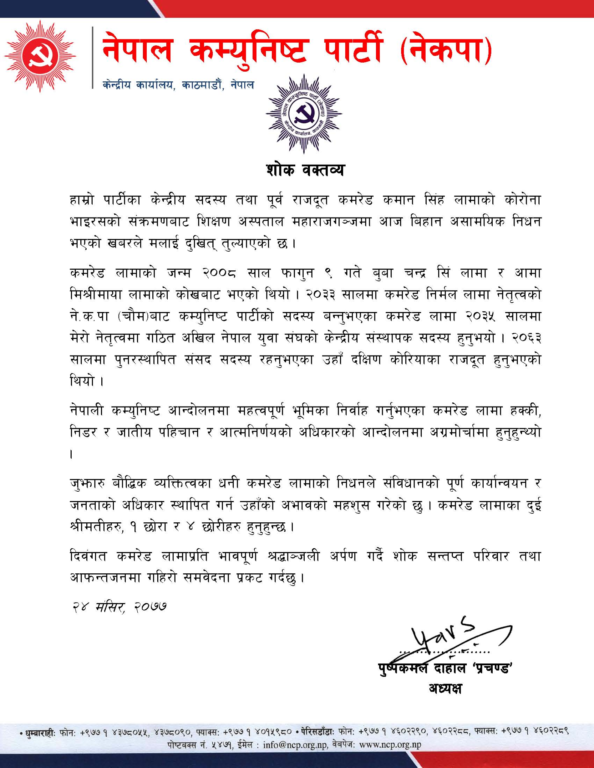 काठमाडौं । सत्तारुढ दल नेपाल कम्युनिष्ट पार्टी (नेकपा) का कार्यकारी अध्यक्ष प्रचण्डले केन्द्रीय सदस्य तथा पूर्वराजदूत कमानसिंह लामाको निधनप्रति दुःख व्यक्त गरेका छन् ।