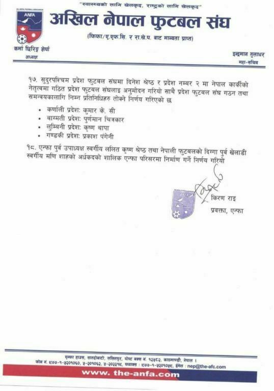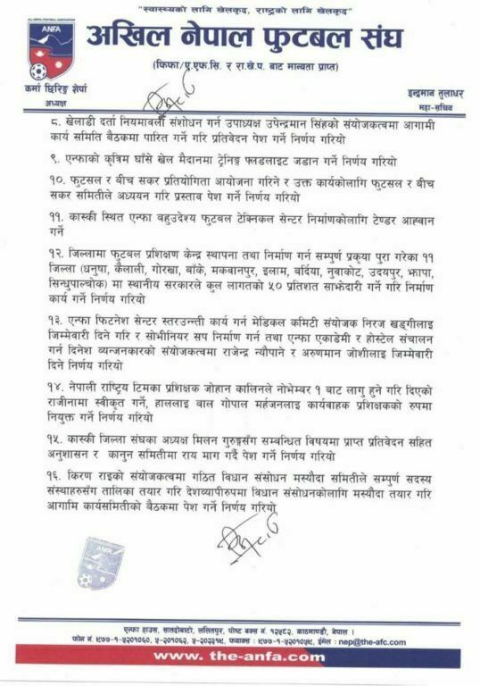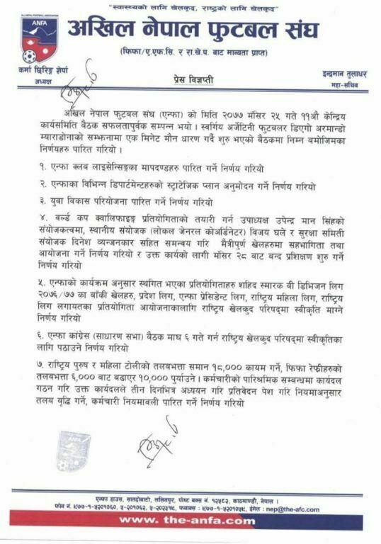 यस्तै, फिफा रेफ्रिको तलब ६ हजारबाट बढाएर १० हजार बनाउने निर्णय एन्फा कार्यसमितिले गरेको छ । कर्मचारीको तलबका विषयमा भने अझै कार्यदल गठन गरी टुङ्ग्याउने एन्फाले जनाएको छ ।