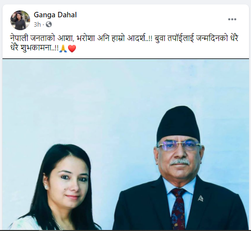 त्यस्तै स्वकीय सचिव समेत रहेकी प्रचण्डपुत्री गंगाले नेपाली जनताको आशा, भरोसा अनि आदर्शका रुपमा सम्झिँदै प्रचण्डलाई शुभकामना दिएकी छिन् । उनले सामाजिक सञ्जालमा लेखेकी छिन्, “नेपाली जनताको आशा, भरोशा अनि हाम्रो आदर्श !! बुवा तपॉईलाई जन्मदिनको धेरै धेरै शुभकामना।
