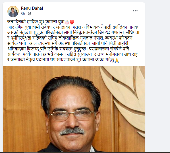 यसैक्रममा प्रचण्ड पुत्रीद्वय रेणु र गंगा दाहालले नेपाली जनताको आशा र भरोसाको रुपमा आफ्नो बुबाको जन्मदिनको शुभकामना दिएका छन् ।
