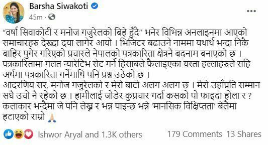 उनले सोसल मिडियामा लेखेकी छन्, “वर्षा शिवाकोटी र मनोज गजुरेलको बिहे हुँदै” भनेर विभिन्न अनलाइनमा आएको समाचारहरु देख्दा दया लागेर आयो । भिजिटर बढाउने नाममा यथार्थ भन्दा निकै बाहिर पुगेर गरिएको प्रचारले नेपालको पत्रकारिता क्षेत्रनै बदनाम बनाएको छ । पत्रकारितामा गलत न्यारेटिभ सेट गर्ने हिसाबले फैलाइएका यस्ता हल्लाहरुले सहि अर्थमा पत्रकारिता गर्नेमाथि पनि प्रश्न उठेको छ ।