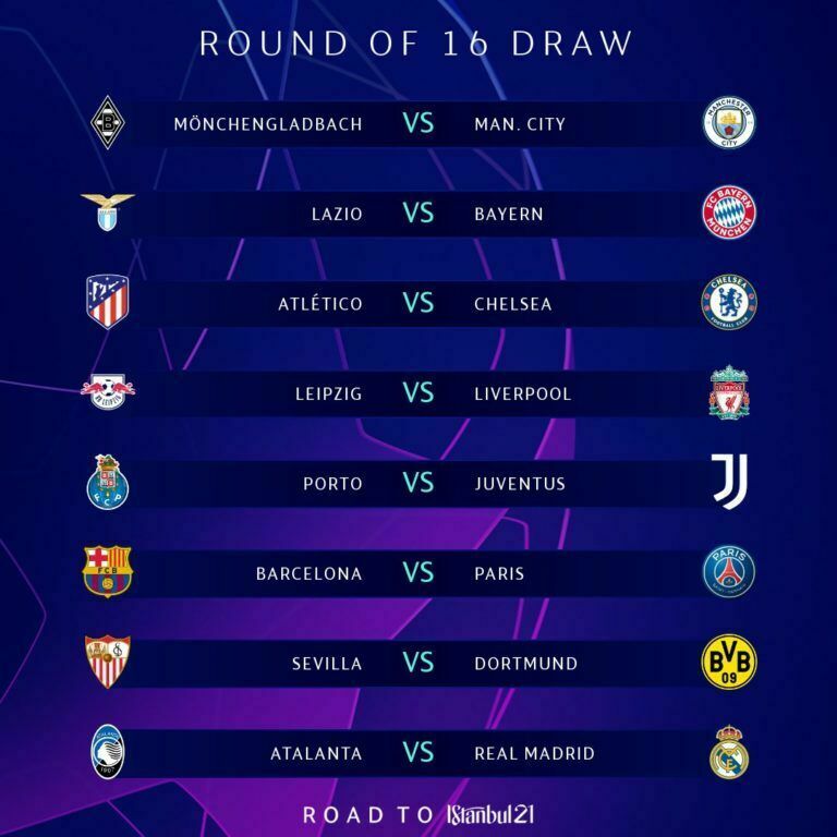 प्रि(क्वाटरफाइनलमा स्पेनिस च्याम्पियन रियल म्याड्रिड र इटालियन टोली एटलान्टा भिड्दै छन् । च्याम्पियन्स लिगको साविक विजेता बायर्न म्युनिखले इटालियन टोली लाजियोको सामना गर्नेछ ।
