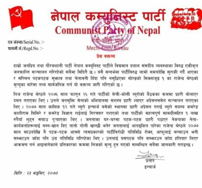 हत्या स्वीकार गरेको विप्लब समूहको यस्तो विज्ञप्ती :