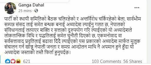 यसैबीच पार्टीको स्थायी समितिको बैठक चलिरहेको र अन्तर्विरोध चर्किरहेको बेला, सार्वभौम सम्पन्न संसदलाई समेत बन्धक बनाई अध्यादेश ल्याईनु गलत भएको प्रचण्डकी स्वकिय सचिव (छोरी) गंगा दाहालले बताएकी छिन् ।