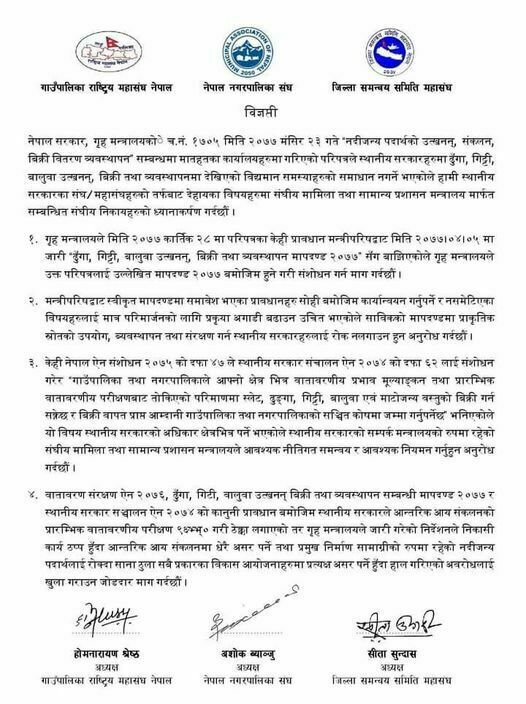 यही मङ्सिर २३ गते जारी गरिएको सो परिपत्रले स्थानीय तहमा ढुंगा, गिट्टी, बालुवा आदिको उत्खनन, बिक्री तथा व्यवस्थापनमा देखिएको विद्यमान समस्यालाई समाधान नगरेको भन्दै सरकारको ध्यानाकर्षण गरिएको हो ।