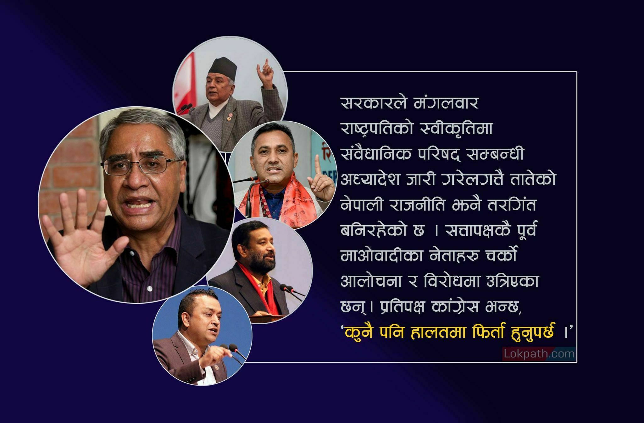 सत्तारुढ दल नेकपाकै नेताहरुले पनि जारी अध्यादेशको घोर निन्दा गरेका छन् भने भर्खरै सरकारविरुद्ध खबरदारी गर्न देशव्यापी प्रदर्शन गरेको प्रमुख प्रतिपक्षी दल नेपाली कांग्रेस अध्यादेश जारी सँगै पुनः एकपटक तातेको छ ।