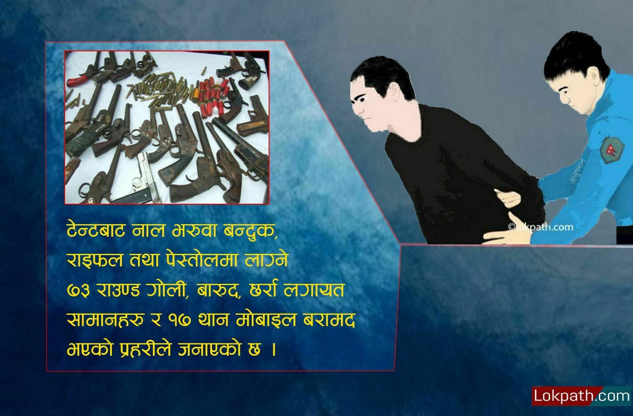 टेन्टबाट नाल भरुवा बन्दुक, राइफल तथा पेस्तोलमा लाग्ने ७३ राउण्ड गोली, बारुद, छर्रालगायत सामानहरु र १७ थान मोबाइल बरामद भएको चिमोरियाले बताए ।