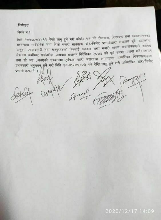 जिल्ला प्रशासन कार्यालय काठमाडौंमा भएको सरोकारवालाहरुको छलफलले भोलीबाट जोरविजोर प्रणाली हटाउने निर्णय गरेको हो । यातायात व्यवसायी र मजदुरका संघ संस्थाका प्रतिनिधि समेतको छलफल पछि उपत्यकाभित्रको जोरविजोर प्रणाली हटाउने निर्णय भएको काठमाडौंका प्रमुख जिल्ला अधिकारी काली प्रसाद पराजुलीले बताए । लामो समयको लक डाउन र निषेधाज्ञापछि सवारी साधन सञ्चालनमा आएपनि जोरविजोर प्रणाली कायम गरिएको थियो ।