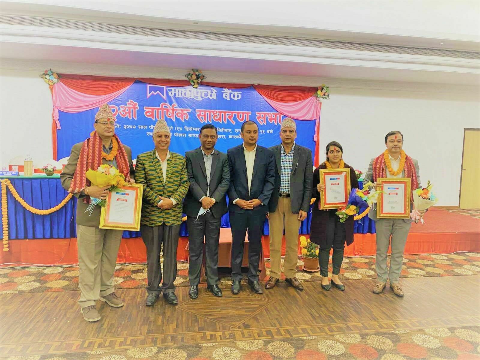 जसमध्ये, चुक्तापूँजीको ३।३७ प्रतिशत नगद र ७।०३ प्रतिशत बोनस लाभांश प्रदान गर्ने प्रस्ताव पारित गरेको छ । साथै, साधारणसभाबाट माछापुच्छ्रे बैंक लि सर्वसाधारण सेयर धनी समूहको तर्फबाट जय मुकुन्द खनाल, विश्व प्रकाश गौतम तथा सृजना कार्की भट्टराईलाई आगामी ४ वर्षको लागि संचालक समितिको सदस्य पदमा निर्विरोध निर्वाचित गरेको छ ।