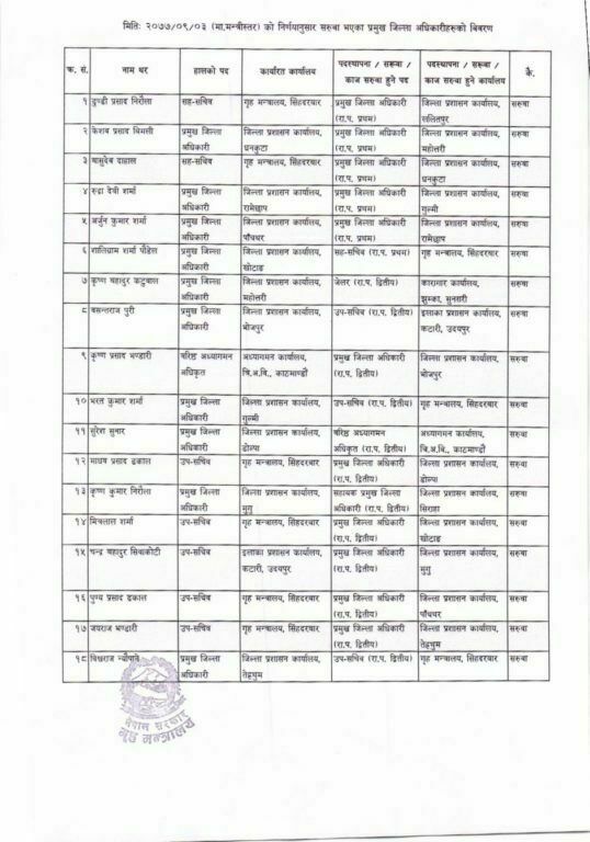 त्यस्तै पाँचथरका सिडिओ अर्जुनकुमार शर्मालाई रामेछाप तथा खोटाङका शालिग्राम शर्मा पौडेललाई गृह मन्त्रालयमा सरूवा गरिएको छ ।