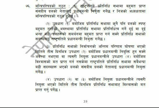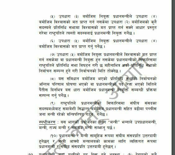 संविधानको धारा ७६ को उपधारा ७ को ५ मा प्रधानमन्त्रीले विश्वासको मत प्राप्त गर्न नसकेमा वा प्रधानमन्त्री नियुक्त हुन नसकेमा प्रधानमन्त्रीको सिफारिसमा राष्ट्रपतिले प्रतिनिधि सभा विघटन गरी ६ महिनाभित्र अर्को प्रतिनिधि सभाको निर्वाचन सम्पन्न हुने गरी निर्वाचनको मिति तोक्ने मात्रै उल्लेख छ। यसर्थ ओलीले संविधानको मर्मविपरीतको कदम चालेको उनको भनाई छ ।