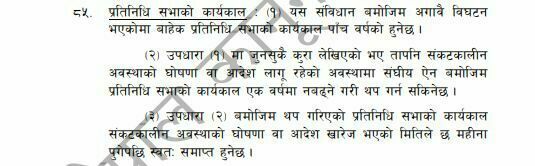 नेपालको संविधानमा संसद विघटनसम्बन्धी प्रावधान स्पष्ट छैन। ‘संविधानको धारा ८५ को १ मा ‘यस संविधान बमोजिम अगावै विघटन भएकामा बाहेक प्रतिनिधि सभाको कार्यकाल ५ वर्षको हुनेछ’ भन्ने उल्लेख छ।