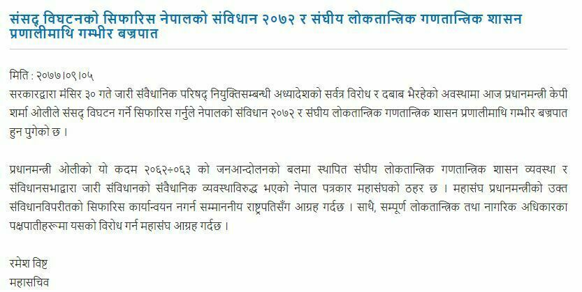 काठमाडौं – प्रधानमन्त्री केपी शर्मा ओलीले संसद विघटन गर्ने सिफारिस गरेपछि नेपाल पत्रकार महासंघले नेपालको संविधान र संघीय लोकतान्त्रिक गणतन्त्रमाथि गम्भीर बज्रपात भएको बताएको छ ।