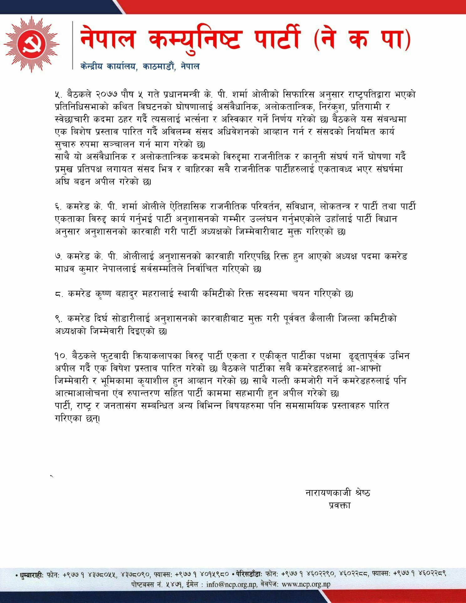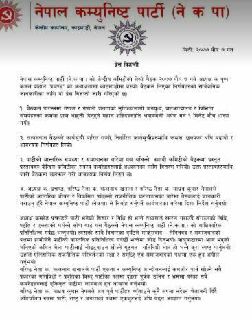 नेकपाका अध्यक्ष पुष्पकमल दाहाल प्रचण्ड र वरिष्ठ नेता माधव नेपाल समूहको केन्द्रीय कमिटी बैठकले पार्टीको अध्यक्षमा वरिष्ठ नेता नेपाललाई चयन गरेको छ।बैठकले पुस ५ गते भएको संसद विघटन गर्ने सरकारको निर्णयलाई असंवैधानिक, अलोकतान्त्रिक, निरंकुश, प्रतिगामी र स्वच्छेचारी ठहर्दै भत्सर्ना गरेको छ । साथै बैठकले अबिलम्ब संसदको कार्य सञ्चालन गर्न तथा सो निर्णयको विरुद्धमा संघर्ष गर्ने घोषणा पनि गरेको छ ।