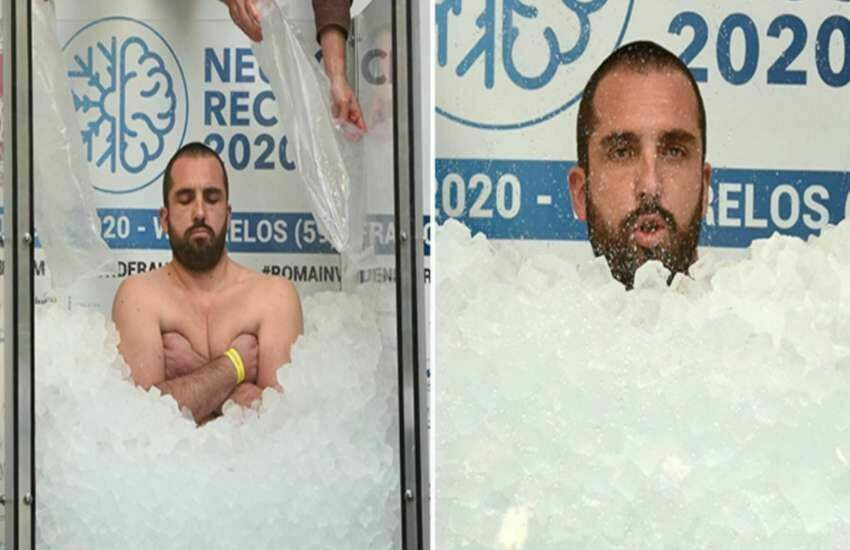 एक व्यक्तिले एउटा अनौठो काम गरेर विश्व रेकर्ड बनाएका छन् । प्रान्सका रोमन भ्यान्डेन्डोर्पले २ घण्टा ३५ मिनेट ४३ सेकेण्ड बर्फको टुक्राले भरिएका ग्लासको केबिनमा बिताएर विश्व रेकर्ड बनाएका छन् ।