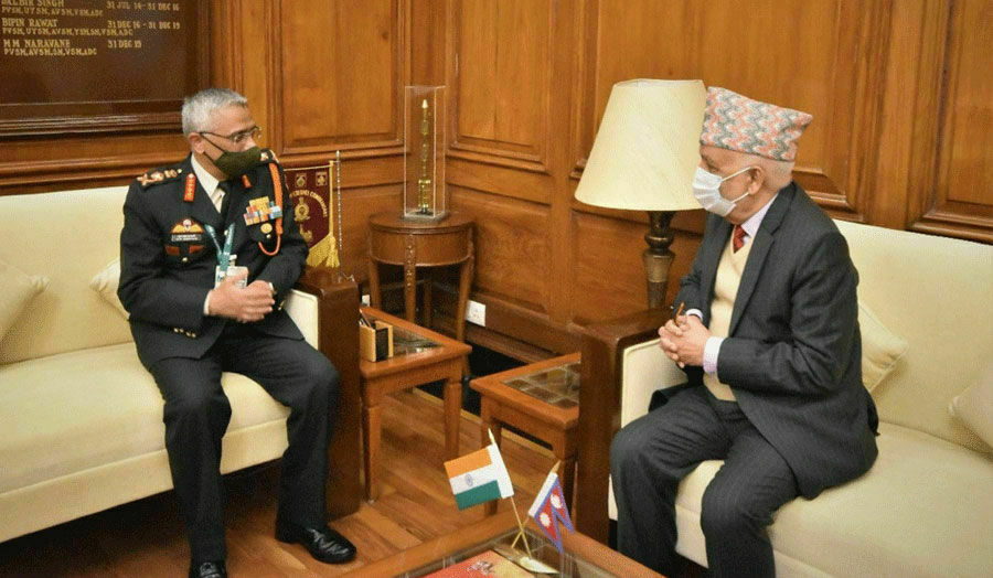 काठमाडौँ– भारतका लागि नेपाली राजदूत निलम्बर आचार्य र भारतका स्थलसेना प्रमुख मनोज मुकुन्द नरवणेबीच बिहिवार भेटवार्ता भएको छ ।