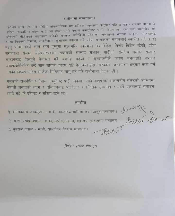 आन्तरिक मामिला तथा कानूनमन्त्री शालिकराम जमरकट्टेल, उधोग पर्यटन बन तथा वातावरण मन्त्री अरुण नेपाल र सामाजिक विकासमन्त्री युवराज दुलालले राजीनामा दिएका हुन् । उनीहरूले मुख्यमन्त्री डोरमणि पौडेल नेतृत्वको सरकारले जनताको भावना अनुरुप काम गर्न नसकेको राजीनामा पत्रमा उल्लेख गरेका छन् ।