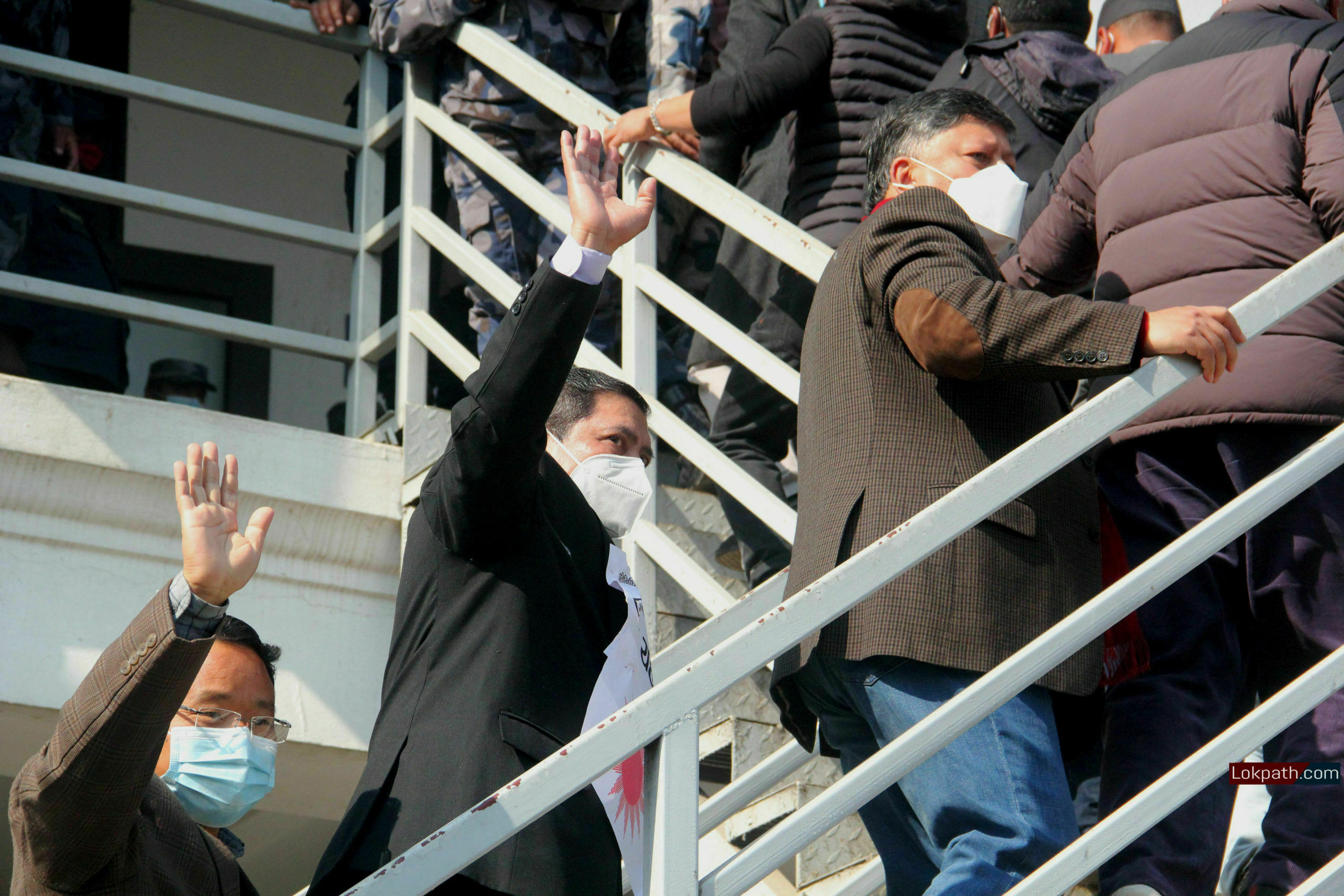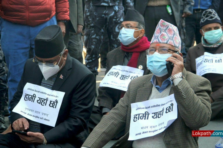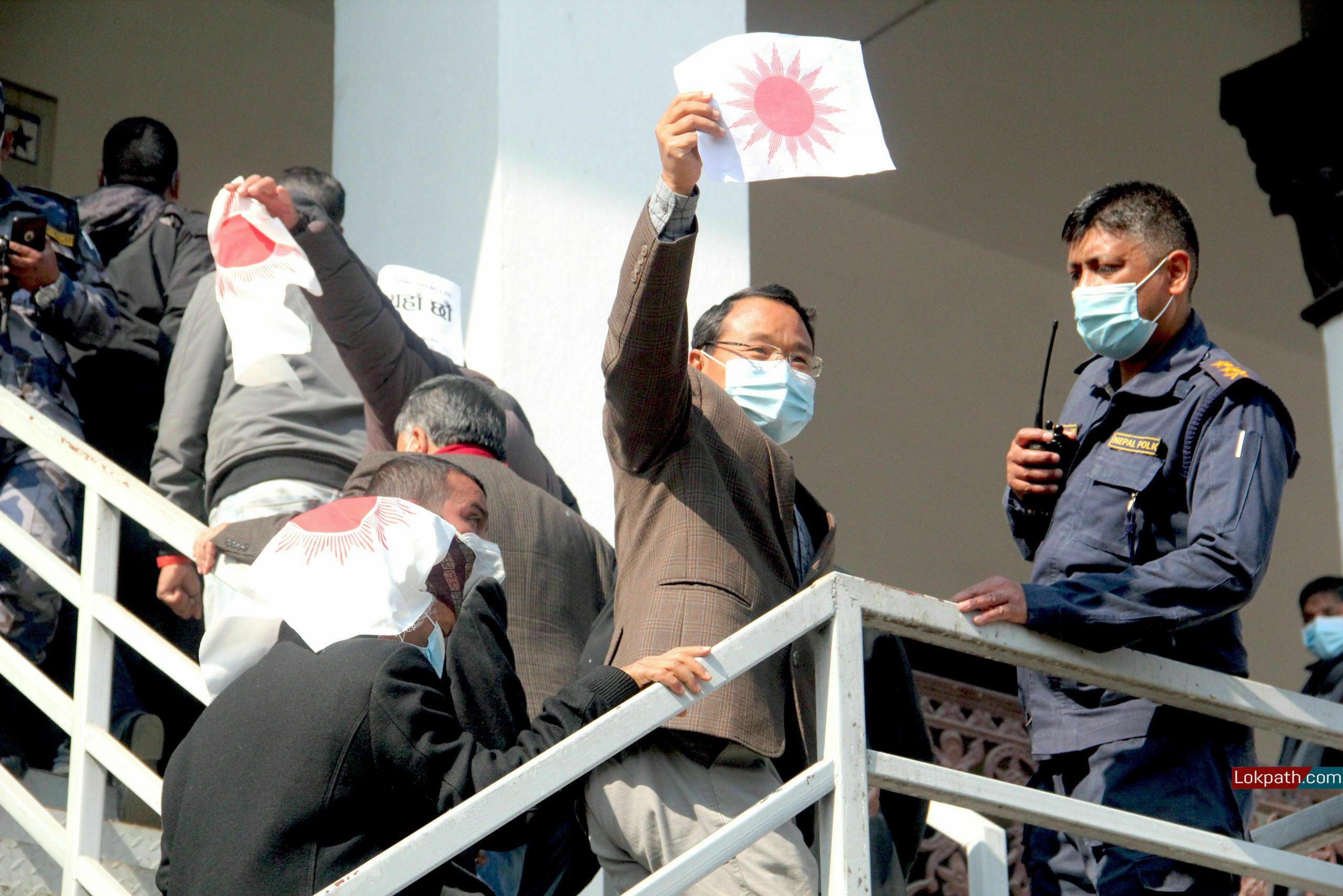 प्रचण्ड-नेपाल समूहका नेता तथा कार्यकर्ताहरुले ‘हामी यहाँ छौं’ जस्ता नारा लेखिएको प्लेकार्ड बोकेर आफ्नो उपस्थिति तथा शक्ति प्रदर्शन गरेका छन् । बिहीवार (हिजो) बसेको प्रचण्ड नेपाल समूहको केन्द्रीय कमिटी बैठकले संसद विघटनविरुद्ध १४ चरणबद्ध आन्दोलनको घोषणा गरेको छ ।