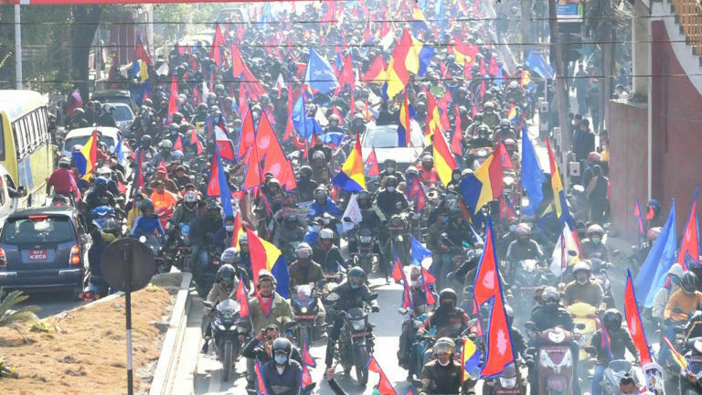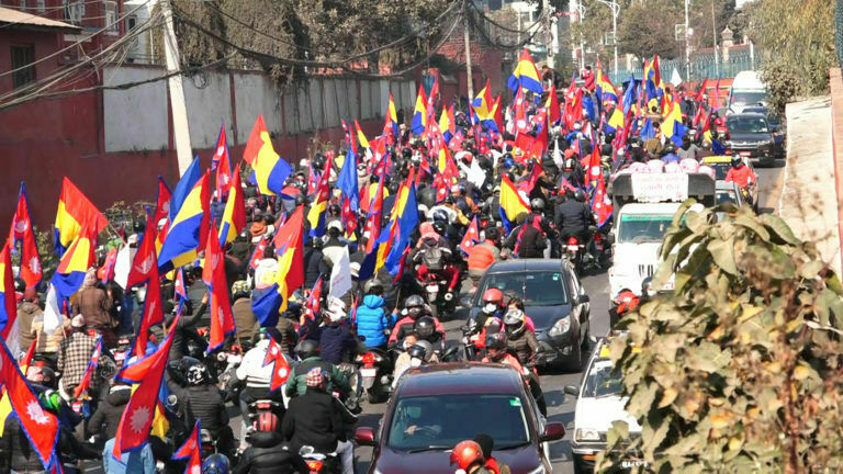 काठमाडौं । राष्ट्रिय प्रजातन्त्र पार्टी (राप्रपा)ले शनिवार काठमाडौंमा मोटरसाइकल र्याली निकालेको छ । राप्रपाले राजसंस्था र हिन्दु राष्ट्रको माग गर्दै काठमाडौंमा मोटरसाइकल र्याली निकालेको हो ।