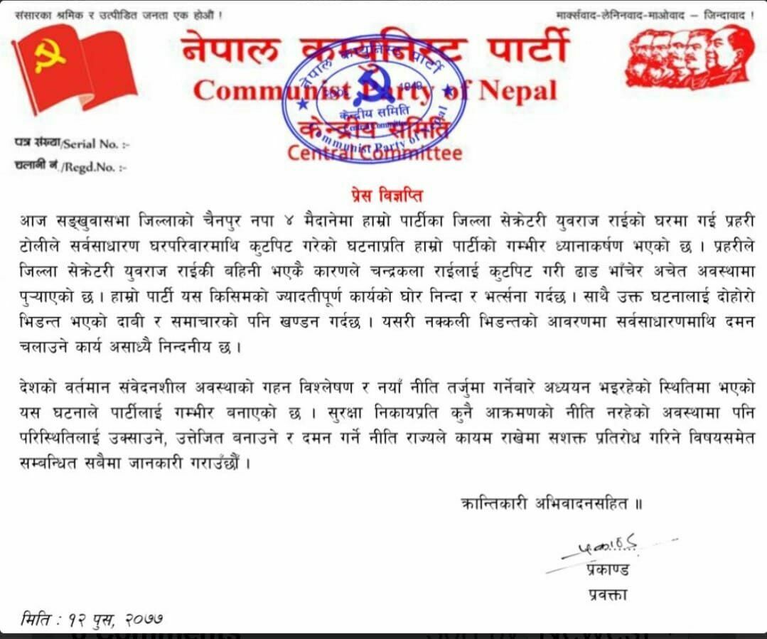 प्रहरी टोलीमाथि फायरिङ गरेको विप्लव समूहको यस्तो विज्ञप्ती :