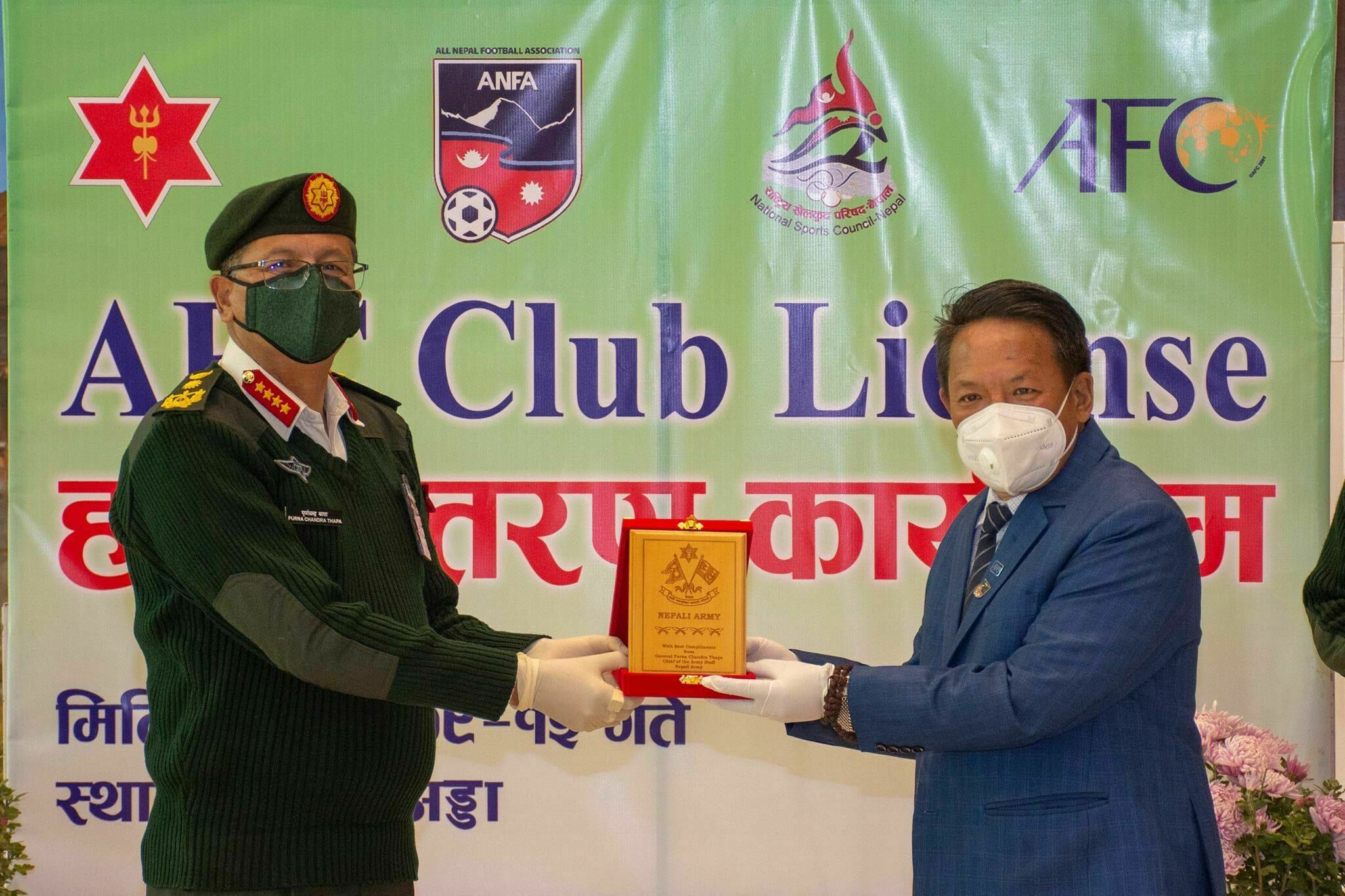 आर्मी मुख्यालयमा भएको कार्यक्रममा नेपाली फुटबलको सर्वोच्च निकाय एन्फाका अध्यक्ष शेर्पाले फिफा र एएफसीको सबै मापदण्ड पूरा गरी पाएको क्लव लाइसेन्सको प्रमाणपत्र आर्मीलाई हस्तान्तरण गरेका हुन् । सो प्रमाणपत्रलाई शेर्पाले आर्मीका प्रमुख पूर्णचन्द्र थापालाई हस्तान्तरण गरेका हुन् । विभिन्न मापदण्ड तोकिएकोमा पूरा गर्दै नेपालको शीर्ष डिभिजन लिग खेल्ने आर्मीलाई गत मंगलवार एएफसीले लाइसेन्स दिने निर्णय गरेको थियो ।