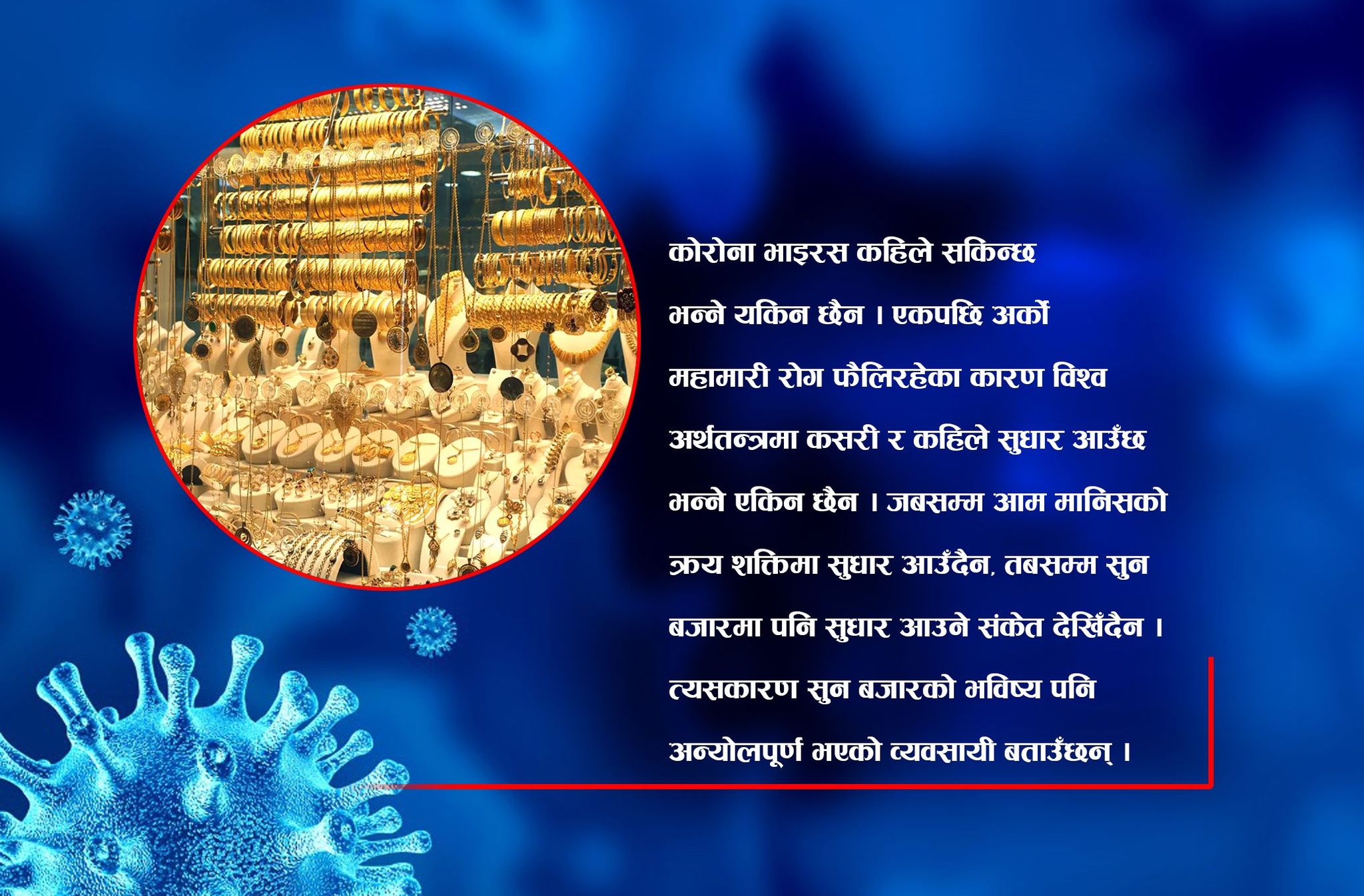 कोरोना भाइरस कहिले सकिन्छ भन्ने यकिन छैन । एक पछि अर्को महामारी रोग फैलिरहेका कारण विश्व अर्थतन्त्रमा कसरी र कहिले सुधार आउँछ भन्ने एकिन छैन । जबसम्म आम मानिसको क्रय शक्तिमा सुधार आउँदैन,तबसम्म सुन बजारमा पनि सुधार आउने संकेत देखिँदैन । त्यसकारण सुन बजारको भविष्य पनि अन्योलपूर्ण भएको व्यवसायी बताउँछन् ।