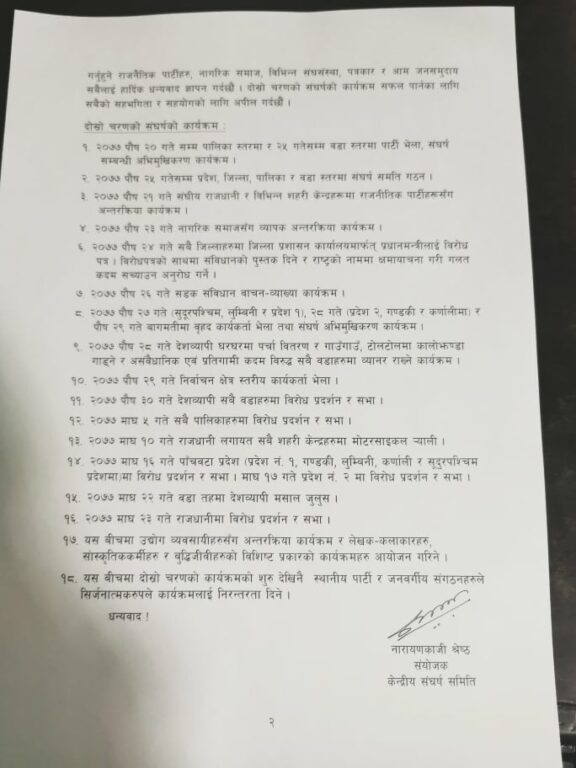 यसैगरी पुस २९ गते निर्वाचनस्तरीय भेला, ३० गते सबै वडाहरुमा विरोध प्रदर्शन, माघ ५ गते पालिकाहरुमा विरोध प्रदर्शन र १० गते काठमाडौं उपत्यकालगायत देशभरका शहरी क्षेत्रमा मोटरसाइकल -याली निकालिने छ भने माघ १६ र १७ गते सबै प्रदेशमा विरोध सभा राखिएको छ । माघ २२ गते देशव्यापी मसालजुलुस गरिनेछ भने माघ २३ गते राजधानीमा विरोध प्रदर्शन र सभा गरिनेछ ।