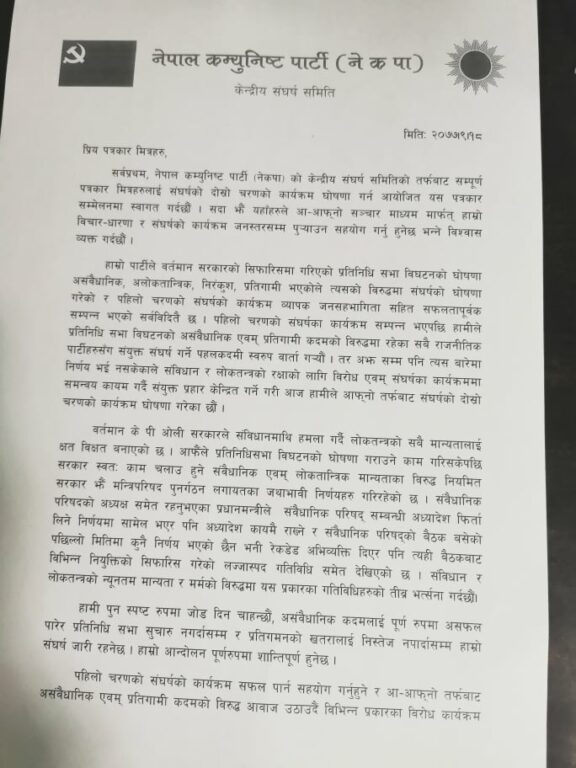 प्रचण्ड–नेपाल पक्षले शनिवार राजधानीमा पत्रकार सम्मेलन गरी पुस २० देखि माघ २३ सम्म चरणबद्ध आन्दोलनको घोषणा गरेको हो ।