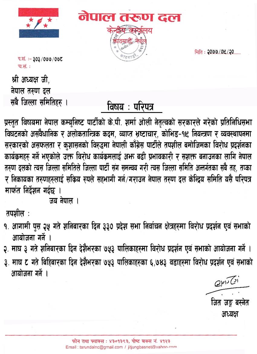 “प्रस्तुत विषयमा नेपाल कम्यूनिष्ट पार्टीको के।पी। शर्मा ओली नेतृत्वको सरकारले गरेको प्रतिनिधिसभा विघटनको असंबैधानिक र अलोकतान्त्रिक कदम, व्याप्त भ्रष्टाचार, कोभिड-१९ नियन्त्रण र व्यवस्थापनमा सरकारको असफलता र कुशासनको विरुद्धमा नेपाली काँग्रेस पार्टीले तपशिल बमोजिमका विरोध प्रदर्शनका कार्यक्रमहरु गर्ने भएकोले उक्त विरोध कार्यक्रमलाई अझ बढी प्रभावकारी र सशक्त बनाउनका लागि नेपाल तरुण दलको त्यस जिल्ला समितिले जिल्ला पार्टी संग समन्वय गरी त्यस जिल्ला समिति अन्तर्गतका सबै तह, तप्का र निकायका तरुणहरुलाई सक्रिय रुपले सहभागी गर्नरगराउन नेपाल तरुण दल केन्द्रिय समिति यसै परिपत्र मार्फत निर्देशन गर्दछ ।” जारी विज्ञप्तिमा भनिएको छ ।