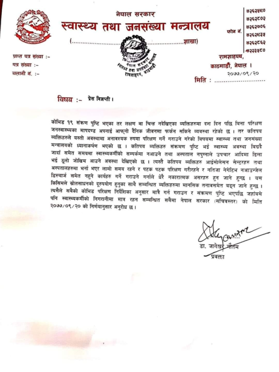 कोरोना पुष्टि भएपनि लक्षण नदेखिएका व्यक्तिहरु दश दिनपछि दैनिक जीवनमा फर्किन सकिने भन्दै स्वास्थ्य तथा जनसंख्या मन्त्रालयले यस्तो आग्रह गरेको हो ।