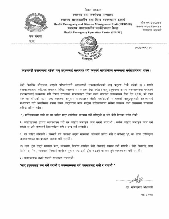 मन्त्रालयको स्वास्थ्य आपतकालीन तथा विपद व्यवस्थापन इकाईले उपत्यकामा बढेको वायु प्रदूषणलाई मध्यनजर गरी सावधानी अपनाउन आग्रह गरेको हो ।