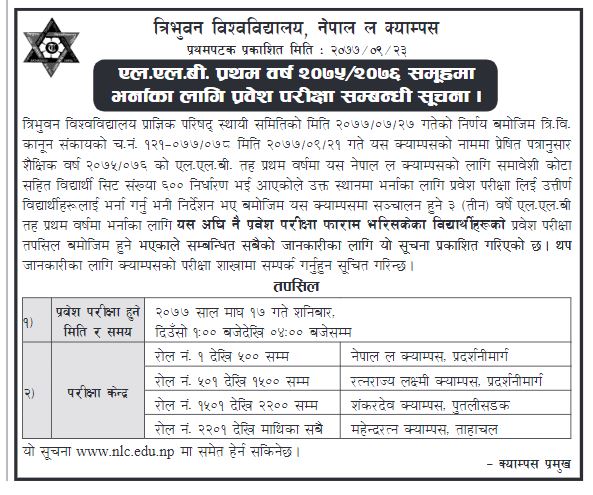 ‘एलएलबी तह प्रथम वर्षमा नेपाल ल क्याम्पसका लागि समावेशी कोटासहित विद्यार्थी सिट संख्या ६ सय निर्धारण भई आएकोले उक्त संख्यामा भर्नाका लागि प्रवेश परीक्षा लिई उत्तिर्ण विद्यार्थीलाई भर्ना लिनु भनी निर्देशन बमोजिम तीन वर्षे एलएलबी पहिलो वर्षका लागि प्रवेश परीक्षा फारम भरेका विद्यार्थीले प्रवेश परीक्षा दिनुपर्ने,’ सूचनामा भनिएको छ।