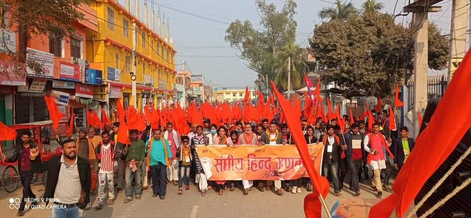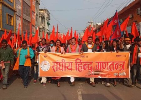 जनकपुरधाम। नेपाललाई संघीय गणतन्त्र सहितको हिन्दु राष्ट्र कायम गर्नुपर्ने माग गर्दै राष्ट्रिय एकता अभियानले प्रदेश २ को अस्थायी राजधानी जनकपुरधाममा वृहत प्रदर्शन गरेको छ ।