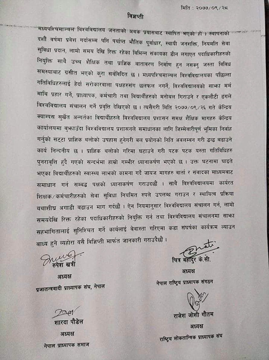मंगलवार संयुक्त विज्ञप्ति जारी गर्दै प्रजातन्त्रवादी प्राध्यापक संघ नेपाल, नेपाल राष्ट्रिय प्राध्यापक संगठन, नेपाल प्राध्यापक समाज र राष्ट्रिय लोकतान्त्रिक प्राध्यापक संघले विश्वविद्यालय प्रशासनको निन्दा गरेका हुन् ।
