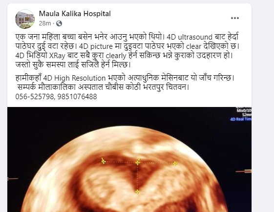 साथै ४ डी प्रविधि राख्नका लागि बढी खर्च हुने भएकाले धेरै अस्पतालहरुमा त्यसको पहुँच नभएको उनको भनाइ छ । नेपालका सिमित अस्पतालहरुमा मात्रै यस्तो प्रविधि भएको र चितवनमा भने मौलाकालिका अस्पतालले नै पहिलो पटक उक्त प्रविधि भित्र्याएको दाबी गरे ।