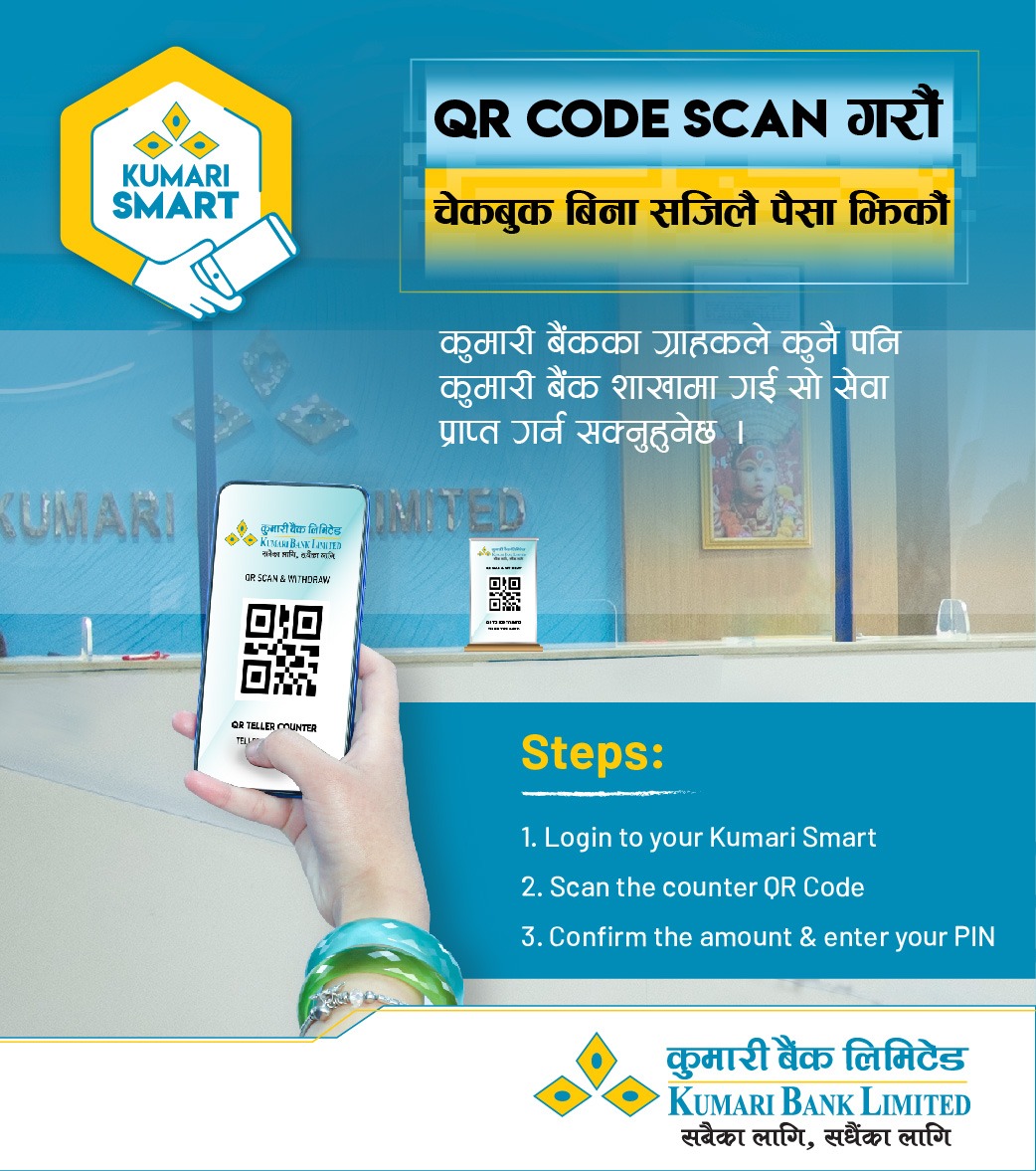 उक्त सुविधा अन्तर्गत कुमारी बैंकका ग्राहकवर्गहरुले बिना कार्ड या चेक आफ्नो कुमारी स्मार्ट मोबाइल एप्लिकेसन मार्फत टेलरमा राखिएको क्यू आर कोड स्क्यान गरी आफ्नो खाताबाट नगद विथड्र गर्न सक्नेछन् ।